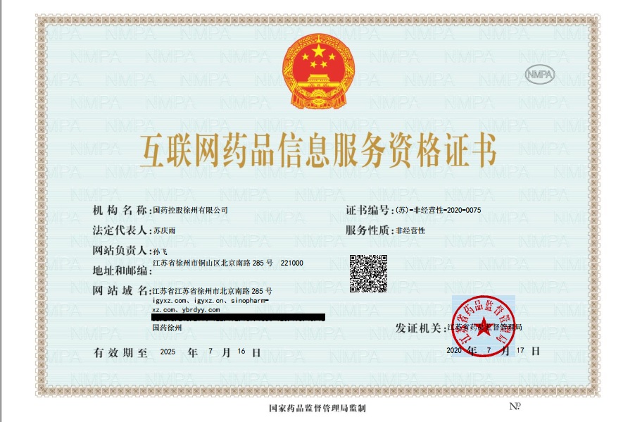 0516-8010-1098 江蘇省徐州市高新技術開發區 北京南路283號萬泰廣場1號樓7-13層 互聯網藥品信息服務資格證書